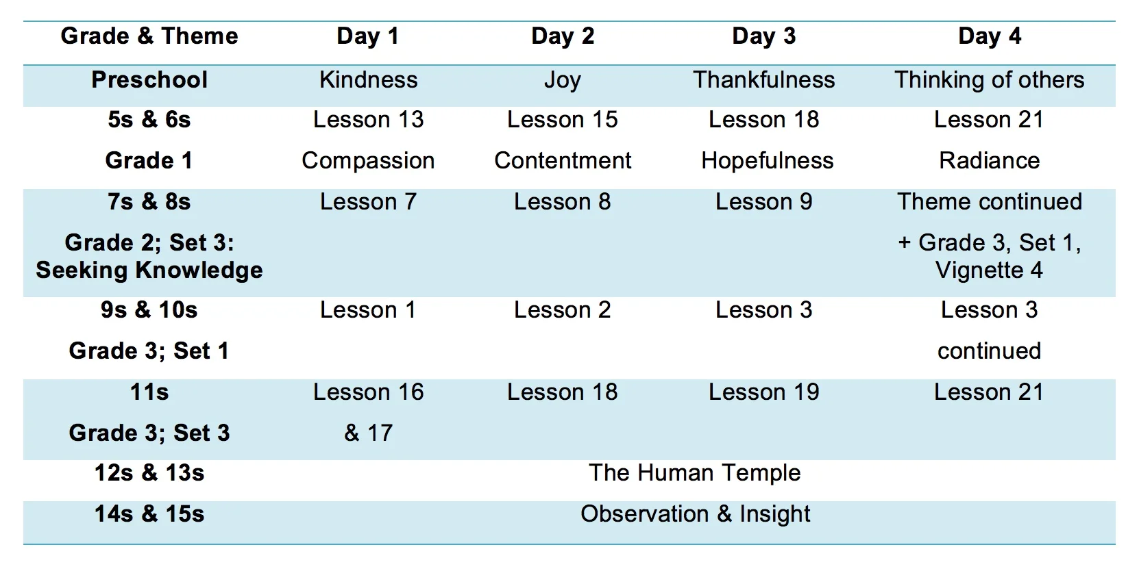 The above schedule of classes in the North Island shows an example of efforts to draw on elements of the Ruhi curriculum for all age groups. Some lessons were specifically chosen due to the upcoming bicentenary, such as 11-year-olds studying Set 3 of Grade 3 about the Life of the Báb.