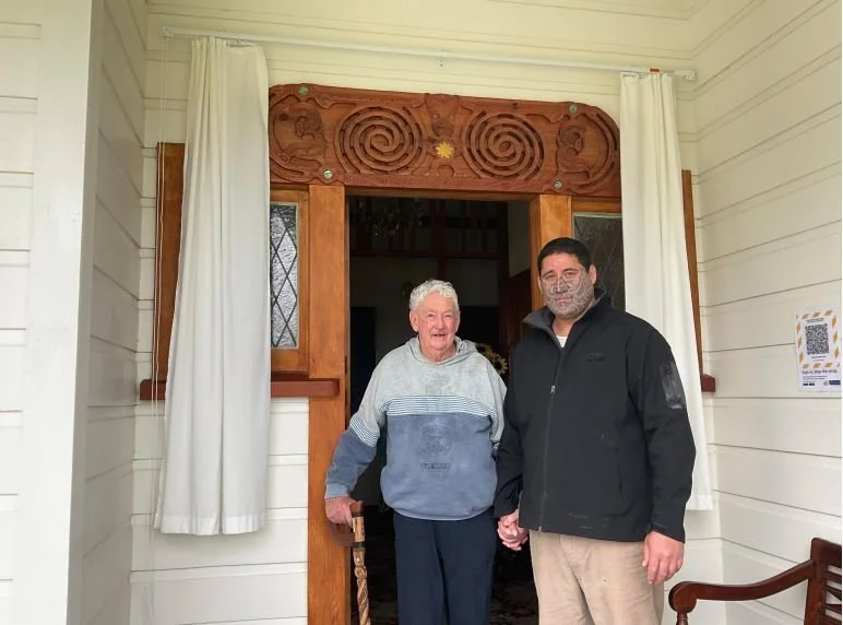 Jim Rutherfurd and Haley Kereama under the carving at the front entrance of the Manawatu Bahá’í Centre.
