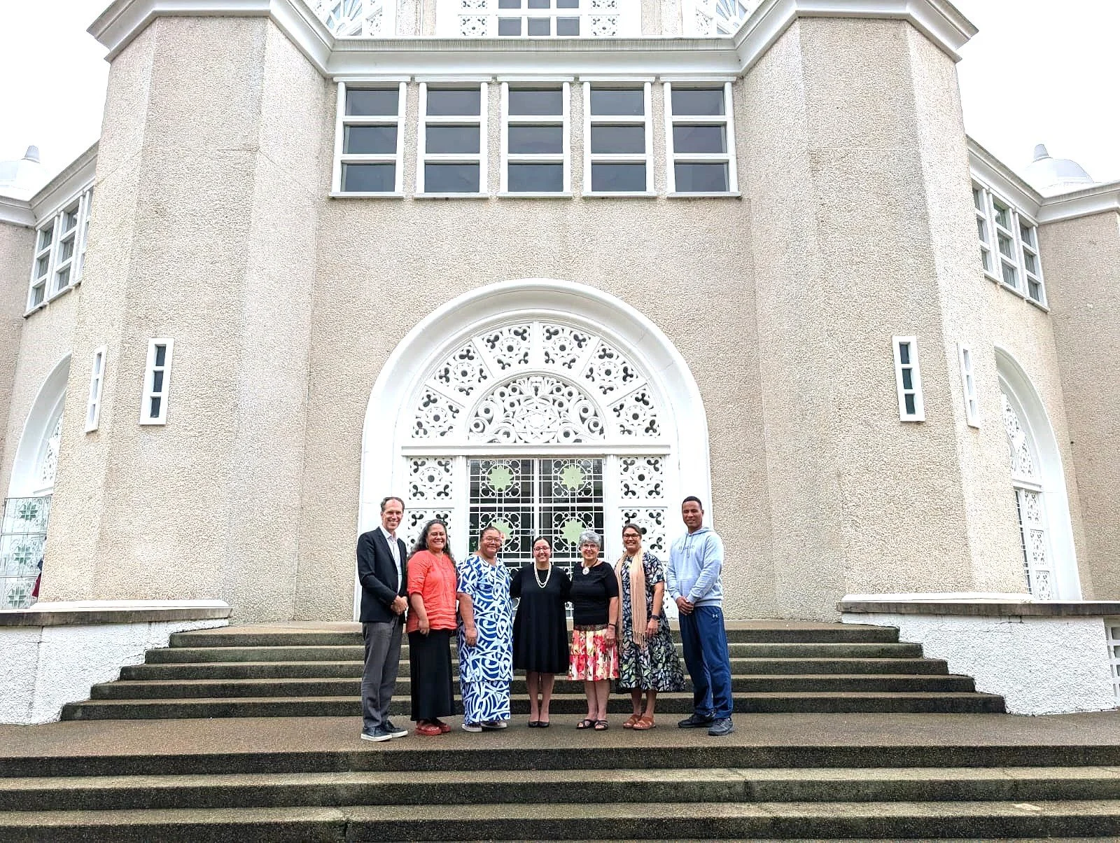 Members of the Regional Board of Trustees for Micronesia and Polynesia, including Mrs Soheyla Bolouri (third from right) of Hamilton, New Zealand. Photographed on the steps of the House of Worship, Sydney.